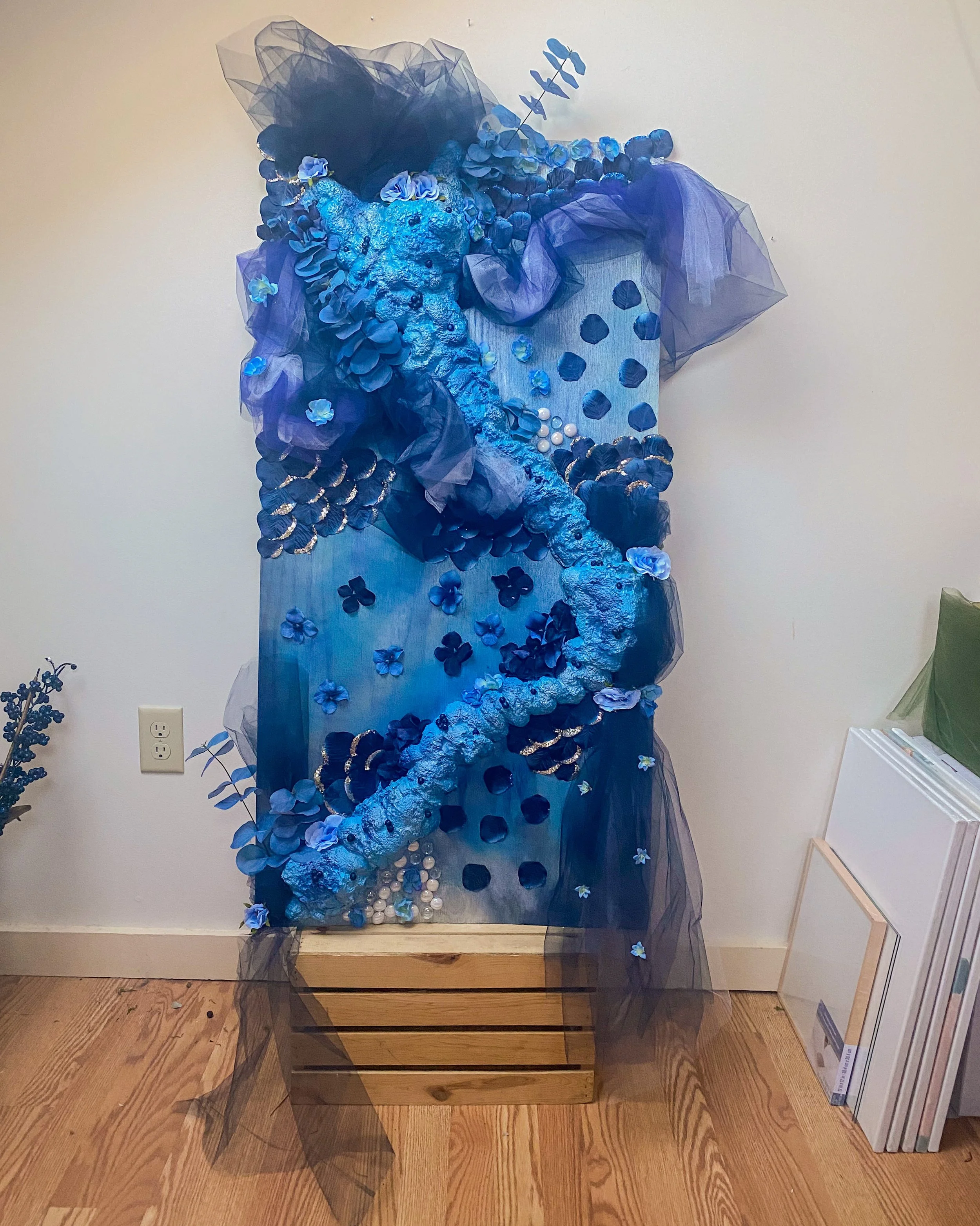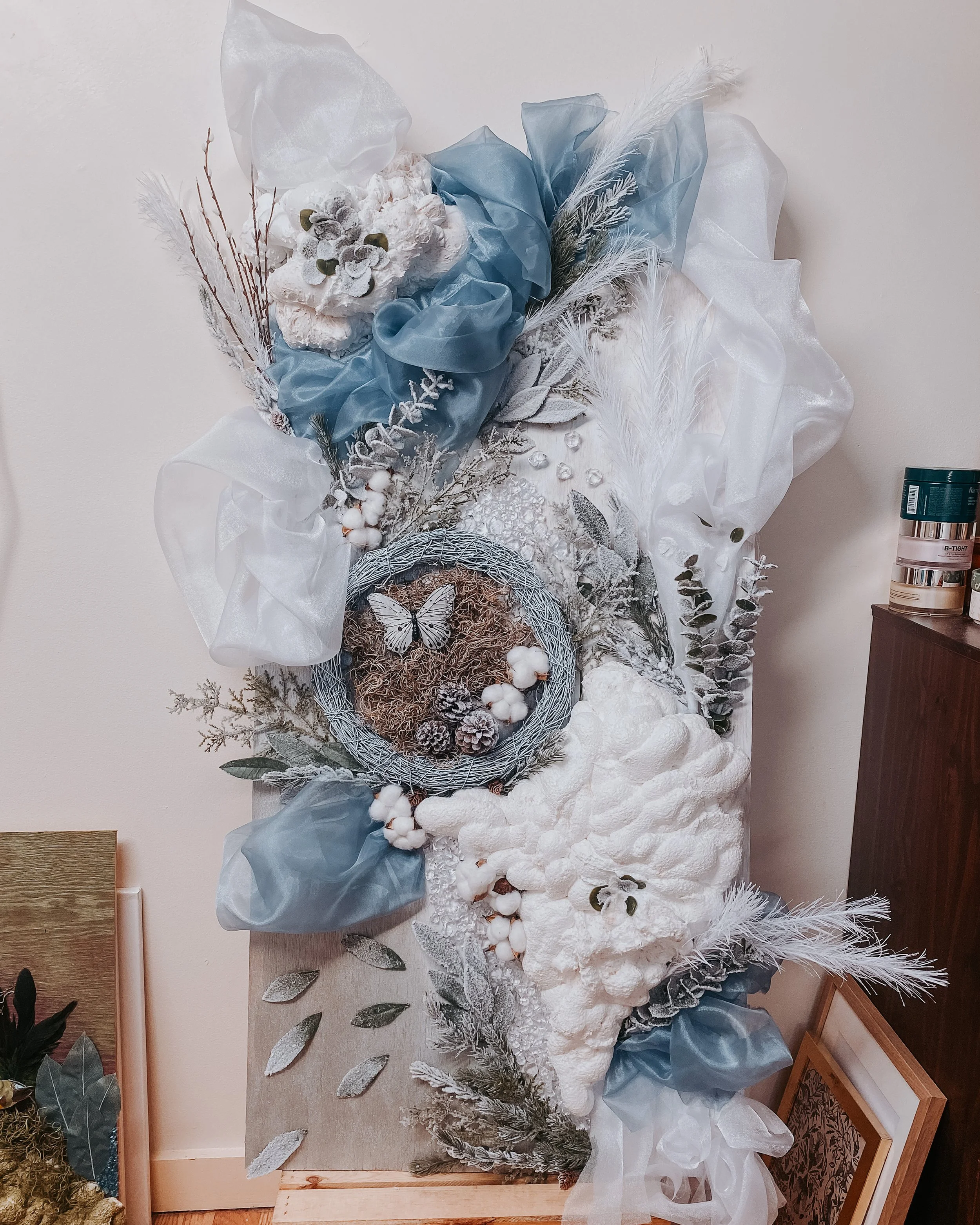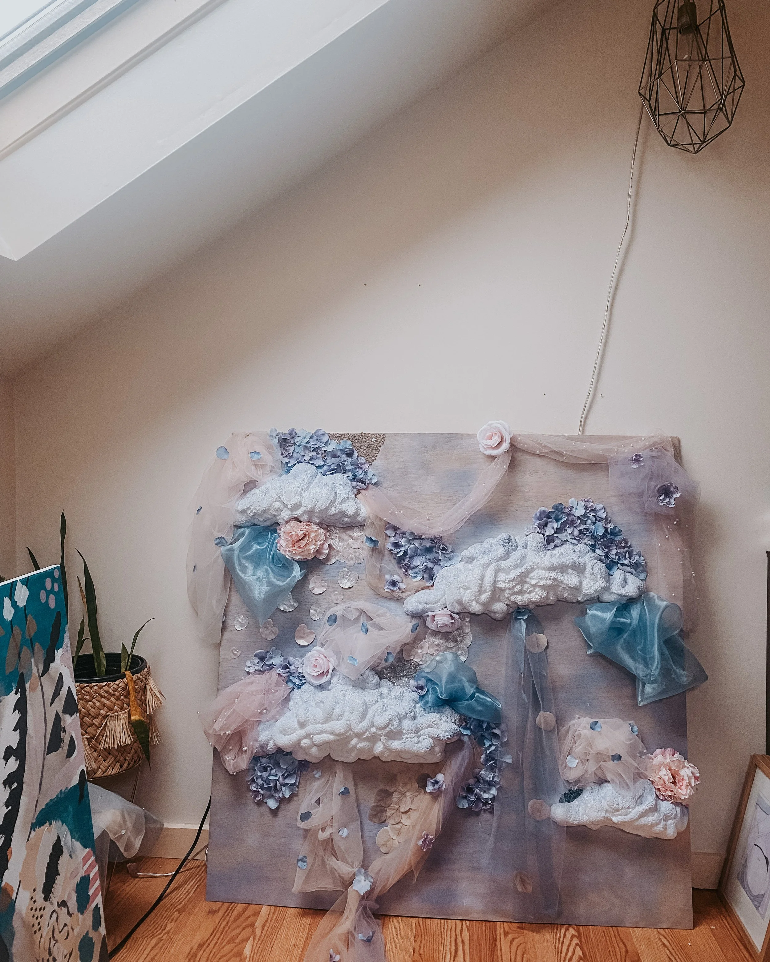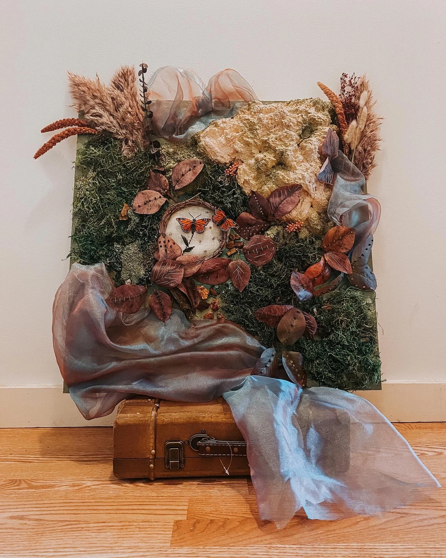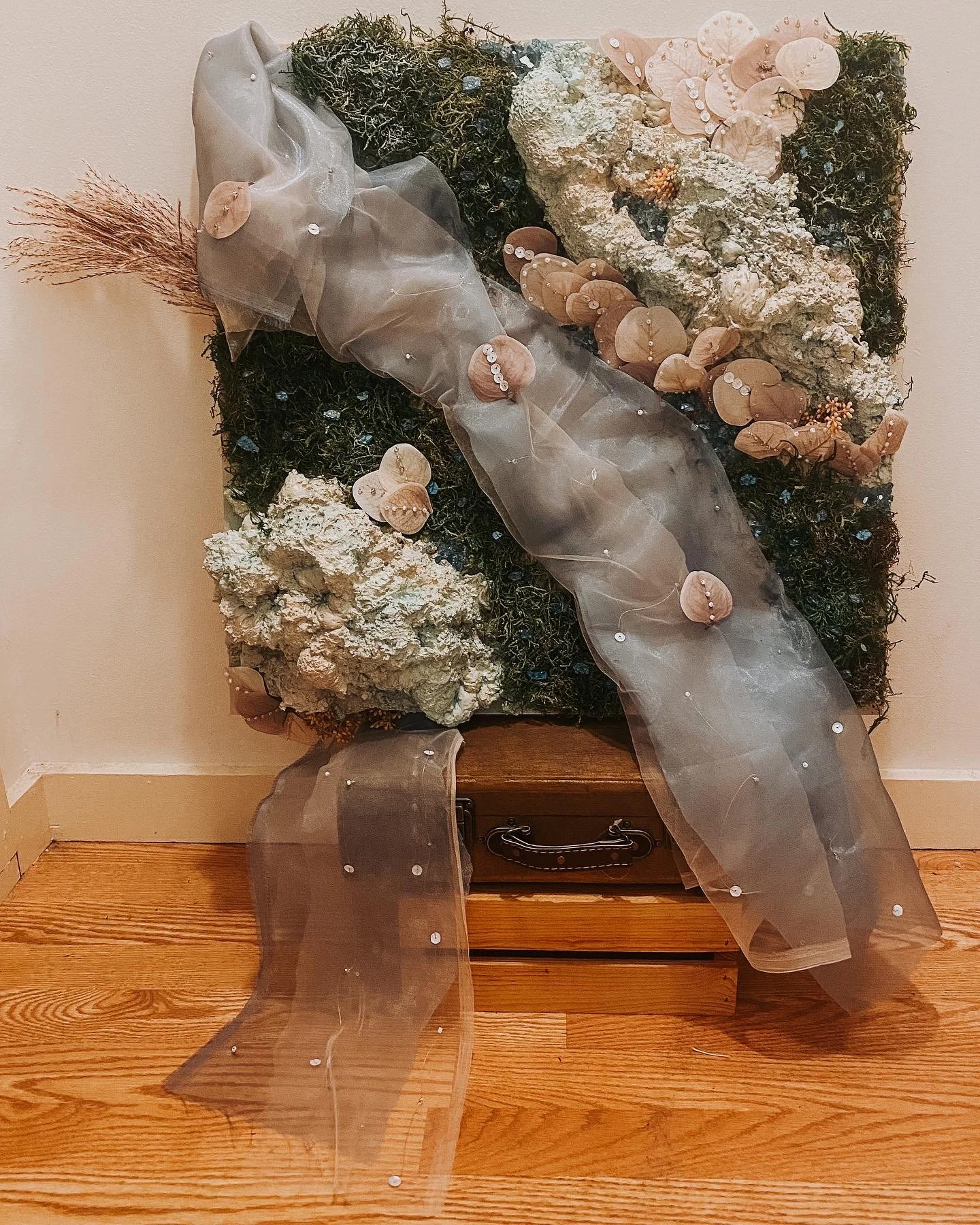 All the Wild in Me is an immersive body of work that blurs the boundary between the natural and the internal. Through layered materials—moss, fabric, resin, embroidery, dried flowers, and found objects—Hallie Driscoll constructs sculptural environments that pulse with memory, tenderness, and quiet resilience. Each piece becomes a landscape of transformation: clouds and roots, fragments and growth, woven together to reflect the process of healing and becoming.